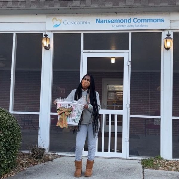 Brianna Walton distributing warm items to the residents at Nansemond Pointe Rehab (Suffolk, VA).
